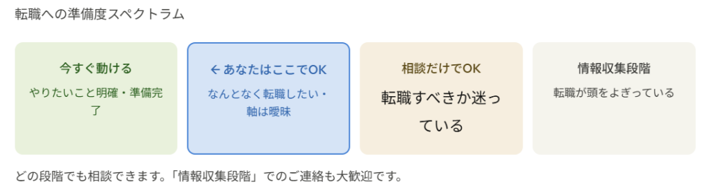 信頼できるエージェントは、軸が定まっていない状態からでも一緒に考えます。「なぜ転職したいか」「今何が嫌か」だけ話せれば、そこから一緒に整理できます。完璧な答えは不要です。